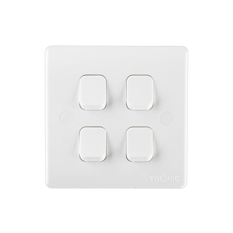 This standard range slim Tronic 4 gang 2 way switch in white has smooth edges to fit into the modern style of ones home or office.  Additional Information Colour White Amp 10A Voltage AC 220-240 Item Dimensions H 90mm x W 90mm Material Bakelite Installation Assembled Warranty 1 Year Application By the entrance
