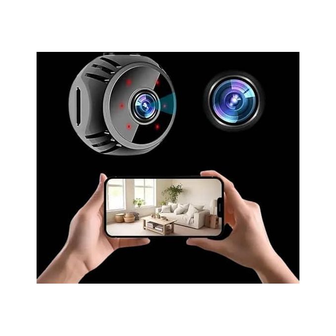 The camera is designed to be discreet, resembling a small, round device with a magnetic mount for easy placement.